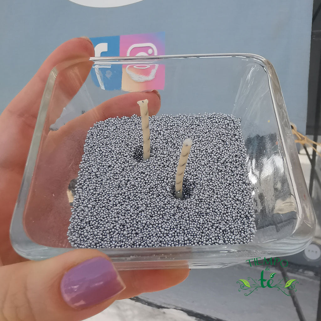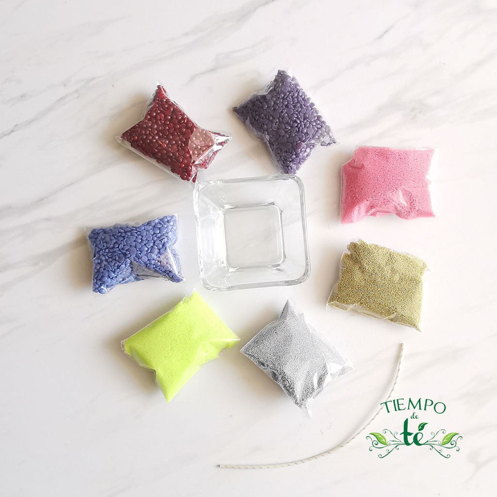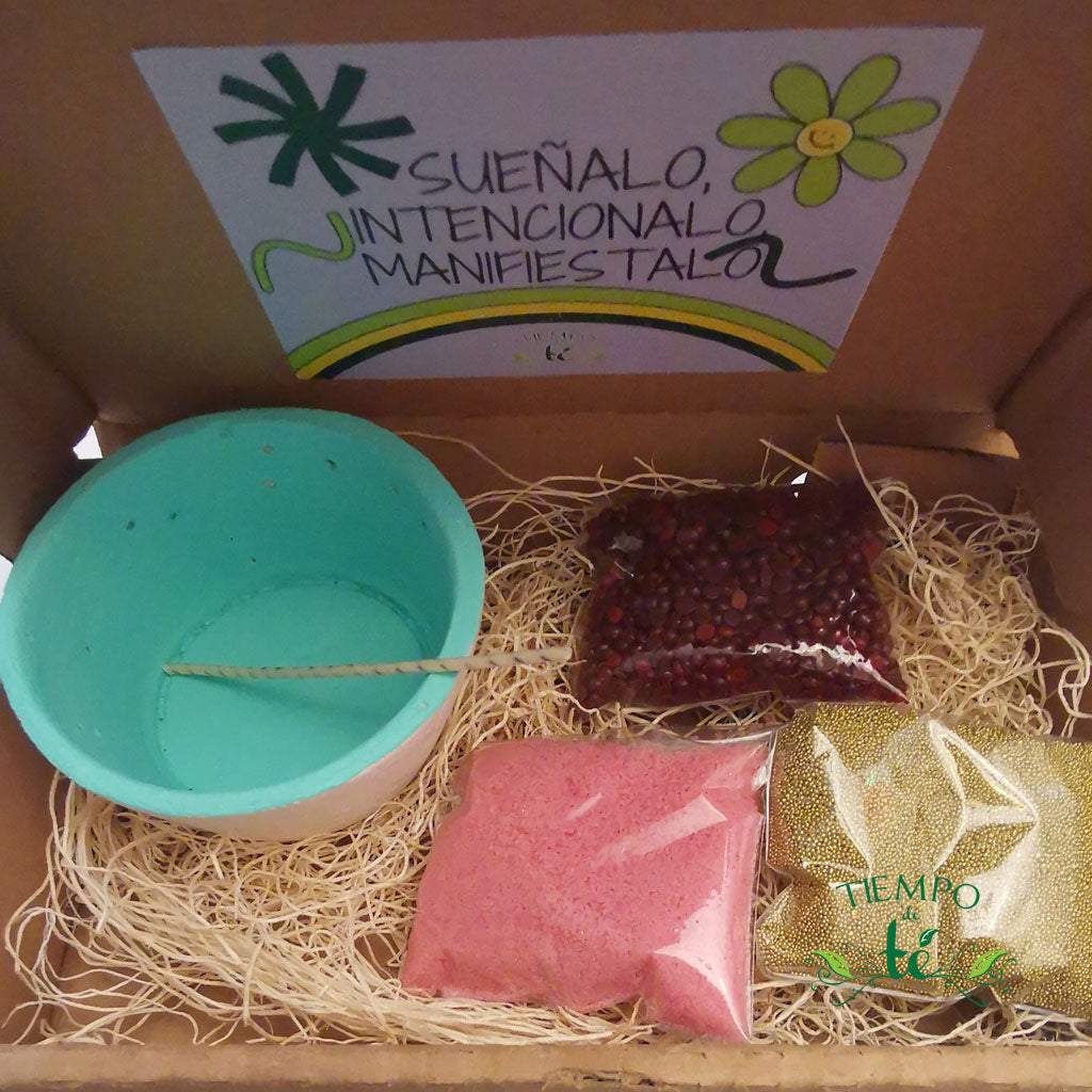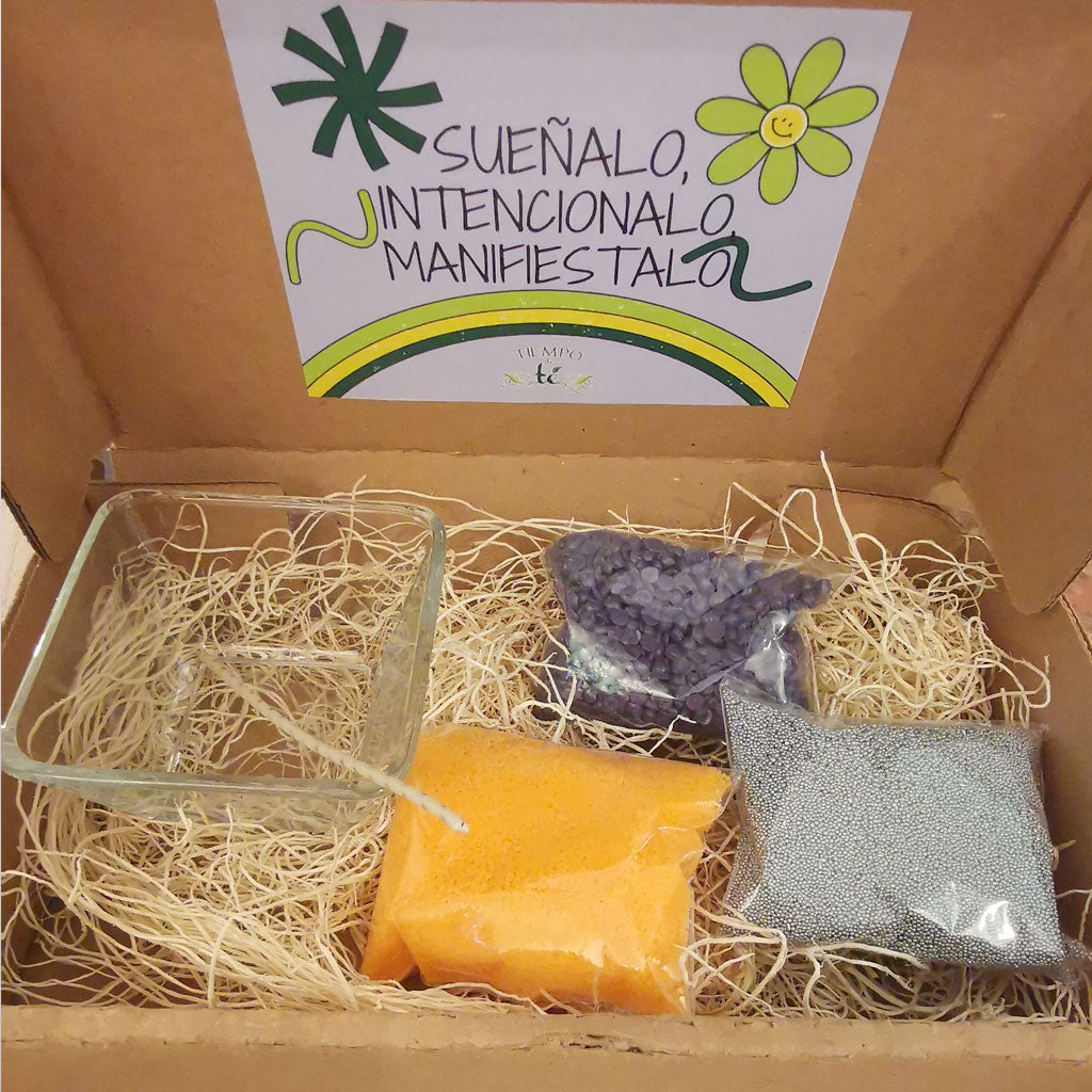Si te gusta la idea del kit, trae 3 paquetes de parafina granulada, un pabilo, el envase, todo adentro de una cajita